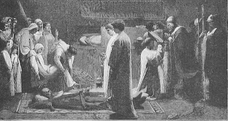 Zum Unterhalt der Armen und Kranken errichtete er mehrere Spitäler und verwendete noch überdies unglaublich viel Geld zum Trost der Notleidenden. Jenen, welche die Verwaltung der Gerechtigkeit zu besorgen hatten, befahl er mit allem Ernst, jedem zu seinem Recht behilflich zu sein, den Witwen und Waisen mit Nachdruck beizustehen und nichts einzuführen, wodurch die Untertanen zu hart gedrückt würden. Wurde jemand überwiesen, daß er wider diese Befehle gehandelt hatte, so entsetzte ihn der König seines Amtes und bestrafte ihn mit aller Schärfe. Die Geschäfte seines Reiches und die Sorge für seine Untertanen ließ sich der heilige König auf das ernstlichste angelegen sein. Die Zeit, welche ihm davon übrig blieb, wendete er weder zum Spielen, Jagen oder anderen Ergötzungen an, sondern zum Gebet und geistliche Lesung. Man sah ihn ganze Stunden mit gebogenen Knien vor dem hochwürdigsten Gut in der Kirche oder vor seinem Kruzifix zubringen. Die Verehrung der jungfräulichen Mutter Maria breitete er in seinem ganzen Reich aus und gebot, alle ihre von der katholischen Kirche angeordneten Festtage feierlich zu begehen. Im Fasten war er so streng, daß er mehrmals ganze Tage lang keine Nahrung zu sich nahm. Unter seinem königlichen Purpur trug er fast allzeit ein rauhes Bußkleid und geißelte sich sehr oft bis auf das Blut. Er wich niemals von dem Weg der Gerechtigkeit und des göttlichen Gesetzes ab, und gelangte so hin zu einem hohen Grad der christlichen Vollkommenheit.