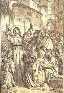 Der Bürgermeister aber, den der Kaiser eingesetzt hatte, und einige hartnäckige Ketzer schnaubten vor Wut wider Rosa, die mit wunderbarer Schärfe und Klarheit des Geistes ihre Irrtümer und Lügen aufdeckte, und jagten sie, unfähig, das dreizehnjährige Mädchen zu widerlegen, mit ihren Eltern aus Viterbo, unter dem Vorwand, daß sonst ein Aufruhr losbrechen würde.