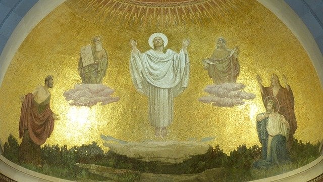 Sechs Tage hernach (1) nahm Jesus den Petrus, Jakobus und Johannes mit sich auf einen hohen Berg, um zu beten. Und während er betete, ward er vor ihnen verklärt (2); sein Angesicht glänzte wie die Sonne, und seine Kleider wurden weiß wie der Schnee. Und siehe, es erschienen Moses und Elias in Herrlichkeit und redeten mit ihm von seinem bevorstehenden Tode in Jerusalem (3). Petrus und seine Gefährten waren (während Jesus betete) eingeschlafen. Beim Erwachen sahen sie Jesu Herrlichkeit und die Männer, die bei ihm waren, und Petrus sprach zu Jesus: „Herr, hier ist gut sein! Willst du, so wollen wir drei Hütten bauen, dir eine, dem Moses eine und dem Elias eine.“ Denn er wußte nicht, was er sagte (4), weil sie sehr erschrocken waren. Als er aber noch redete, siehe, da überschattete sie eine lichte Wolke (5), in die Moses und Elias hinein gingen, und eine Stimme erscholl aus der Wolke: „Dieser ist mein geliebter Sohn, an dem ich mein Wohlgefallen habe; ihn höret!“ Und da die Stimme erscholl, war Jesus allein; die Jünger aber fielen auf ihr Angesicht und fürchteten sich sehr. Jesus aber trat hinzu, rührte sie an und sprach: „Stehet auf und fürchtet euch nicht!“ Als sie nun ihre Augen aufhoben, sahen sie niemand mehr als Jesus allein.