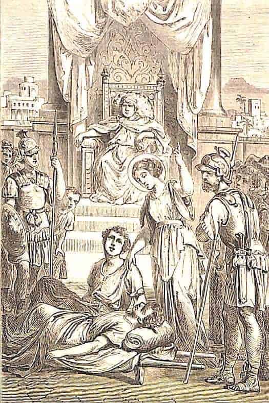 Unter ihren Sklavinnen befand sich auch eine Christin aus Antiochia in Syrien, Seraphia genannt. Sie war ein Muster von Anstand und Bescheidenheit, sprach sehr wenig, und stets in einem höflichen, liebreichen Ton: sie schmeichelte niemals ihrer Herrin in der kriechenden Art ihrer Mitsklavinnen, und entschuldigte ihr Nicht-Gehorchen mit der achtungsvollsten Ehrfurcht bei Sabina, so oft diese von ihr etwas verlangte, was das christliche Gesetz nicht erlaubte. In dieser Beziehung kannte sie keine Furcht vor den Vorwürfen und Strafen, die nicht selten sehr blutig waren; sie ertrug dieselben mit solcher Geduld, daß nie ein Wölklein des Mißmutes oder Zornes ihr mild-ernstes Angesicht trübte. Bei allen andern Aufträgen gehorchte sie mit freudiger Pünktlichkeit und verrichte die geringsten und schmutzigsten Arbeiten mit einer unerklärlichen Vorliebe.