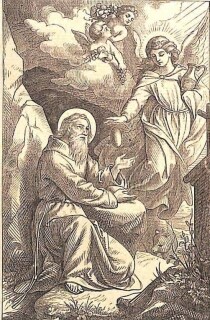 Frei von allen Erdensorgen und Menschen-Rücksichten heiligte der fromme Einsiedler die Tage und Nächte in stiller Betrachtung und Beschauung der göttlichen Offenbarung, welche in wunderbarer Kürze und Reichhaltigkeit in den zwölf Artikeln des apostolischen Glaubens-Bekenntnisses enthalten ist: auf den Flügeln der Hoffnung und der Liebe hielt er seine Seele empor gehoben über das Irdische, und die Engel trugen den Weihrauch des Gebetes, den er auf der Glut seines Bußeifers und Fastens verbrannte, vor den Thron des Allerhöchsten. Der gütige Gott, welcher die Vögel in den Lüften nährt und denRaben in der Wüste speist, erfreute den treuen Diener öfters durch Engels-Erscheinungen, welche ihm erquickende Nahrung brachten.