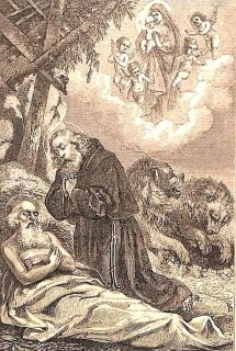 Der Tod des heiligen Paulus, des Patriarchen der Wüste, fand im Jahre 342 im 113. Lebensjahr statt; er wird abgebildet mit Palmblättern bekleidet, einen Raben, der Brot im Schnabel hält, zur Seite. –