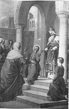 Nach Legenden und außerbliblischen Überlieferungen, die, einige apokryphische Ausschmückungen abgerechnet, durchaus nicht der geschichtlichen Wahrhaftigkeit entbehren, sollen die Eltern das heilige Kind schon gegen das dritte Jahr in den Tempel gebracht und dort zur Erziehung zurück gelassen haben. Vielleicht hatten sie, wie einst Anna, die Mutter Samuels (1. Kg. 1, 22 28), gelobt, das Kind, wenn es ihnen geschenkt würde, dem Dienste Gottes zu weihen. Solche Gelöbnisse der Eltern, ihre Kinder Gott zu schenken, waren im Gesetz vorgesehen (Vv. 27, 1 2) und in der Tat nicht selten. So wurde Samuel von der Mutter gleich nach der Entwöhnung in den Tempel gebracht (1. Kg. 1, 24). Diese Gott geweihten Kinder wurden wahrscheinlich in Nebengebäuden des Tempels untergebracht (4. Kg. 11, 3; 1. Chr. 9, 27 33), wo sie erzogen und zum Dienste des Tempels verwendet wurden (Ex. 38, 8; 1. Kg. 2, 22; 2. Makk. 3, 29). Es war natürlicher Weise für die Eltern gewiß ein Opfer, das geliebte Kind in dem alter, da die jahrelange elterliche Sorge mit unendlich süßen Freuden an der aufsprossenden Schönheit und an dem erwachenden Sprech- und Denkvermögen und an der erwidernden Liebe Seiten des Kindes belohnt wurde, fremden Händen anzuvertrauen.Aber sie waren heilige Seelen, die mehr Gott und das Wohl des Kindes als ihr Genügen suchten. Für eine große Ehre hielten sie es, ihr Töchterlein im Tempel gleichsam unter den Augen Gottes zu wissen. So brachten sie denn Maria zum Tempel.