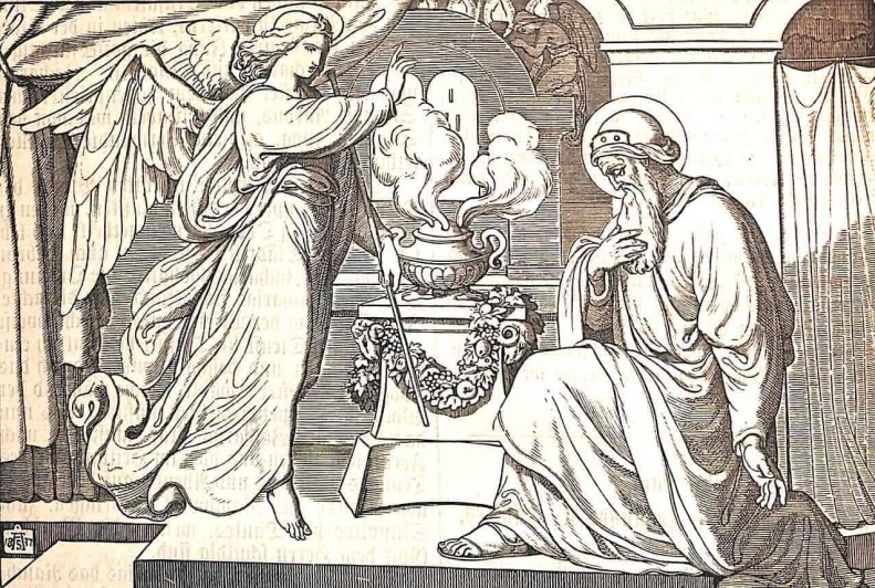 Als nun Zacharias einst nach der Ordnung seiner Priesterklasse den heiligen Dienst im Tempel hatte, traf ihn das Los (6), das Räucheropfer im Heiligtum anzuzünden, und er ging in das Heiligtum; die ganze Menge des Volkes aber war draußen im Vorhof und betete zur Zeit des Räucheropfers. (7) Da erschien ihm ein Engel, an der rechten Seite des Altares stehend. Zacharias erschrak, als er ihn sah. Der Engel aber sprach zu ihm (8): „Fürchte dich nicht, Zacharias! Dein Gebet (9) ist erhört. Elisabeth, dein Weib, wird einen Sohn gebären, den sollst du Johannes (10) nennen. Du wirst Freude und Wonne an ihm haben, und viele werden über seine Geburt frohlocken. Denn er wird groß sein (11) vor dem Herrn. Wein und berauschendes Getränk wird er nicht trinken (12) und schon im Mutterschoß mit dem Heiligen Geist erfüllt werden. (13) Er wird viele von den Kindern Israels zu dem Herrn, ihrem Gott, bekehren und wird im Geiste und in der Kraft des Elias vor ihm hergehen (14), um die Herzen der Väter zu den Kindern zu wenden und die Ungläubigen zur Weisheit der Gerechten, um dem Herrn ein vollkommenes Volk zu bereiten.“ Zacharias erwiderte dem Engel: „Woher soll ich erkennen, daß das geschehen wird? Denn ich bin alt, und auch mein Weib ist schon hoch in Jahren.“ Der Engel antwortete ihm: „Ich bin Gabriel, der vor Gott steht (15), und bin gesandt, dir diese frohe Botschaft zu bringen. Und siehe, du wirst stumm sein bis auf den Tag, da diese geschehen wird, darum, weil du meinen Worten nicht geglaubt hast.“ Das Volk aber wartete auf Zacharias und wunderte sich, daß er so lange im Heiligtum verweilte. Als er nun herauskam, konnte er nicht zu ihnen reden (16), und sie merkten, daß er eine Erscheinung im Tempel gehabt habe.